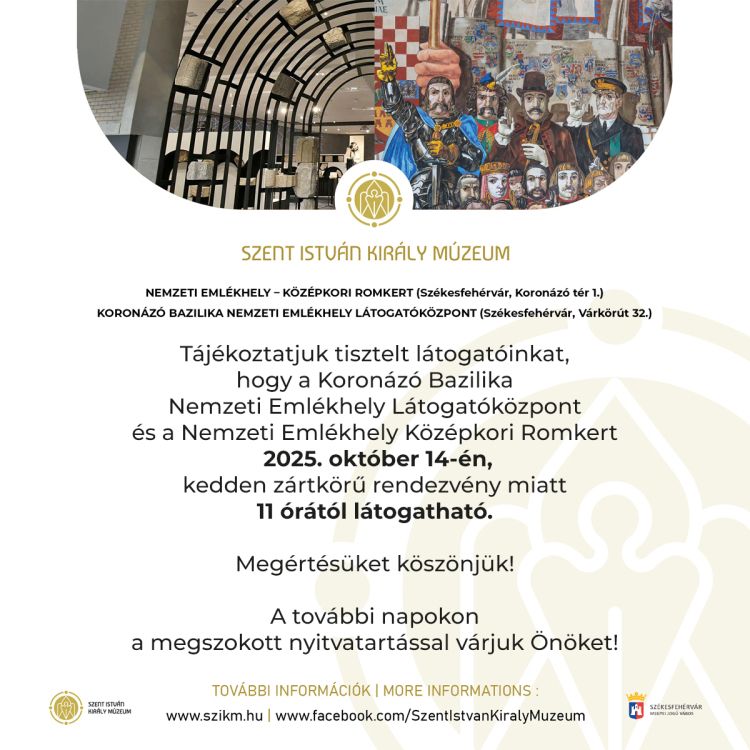 Eltérő nyitvatartás - Koronázó Bazilika Nemzeti Emlékhely Látogatóközpont, és Nemzeti Emlékhely Középkori Romkert