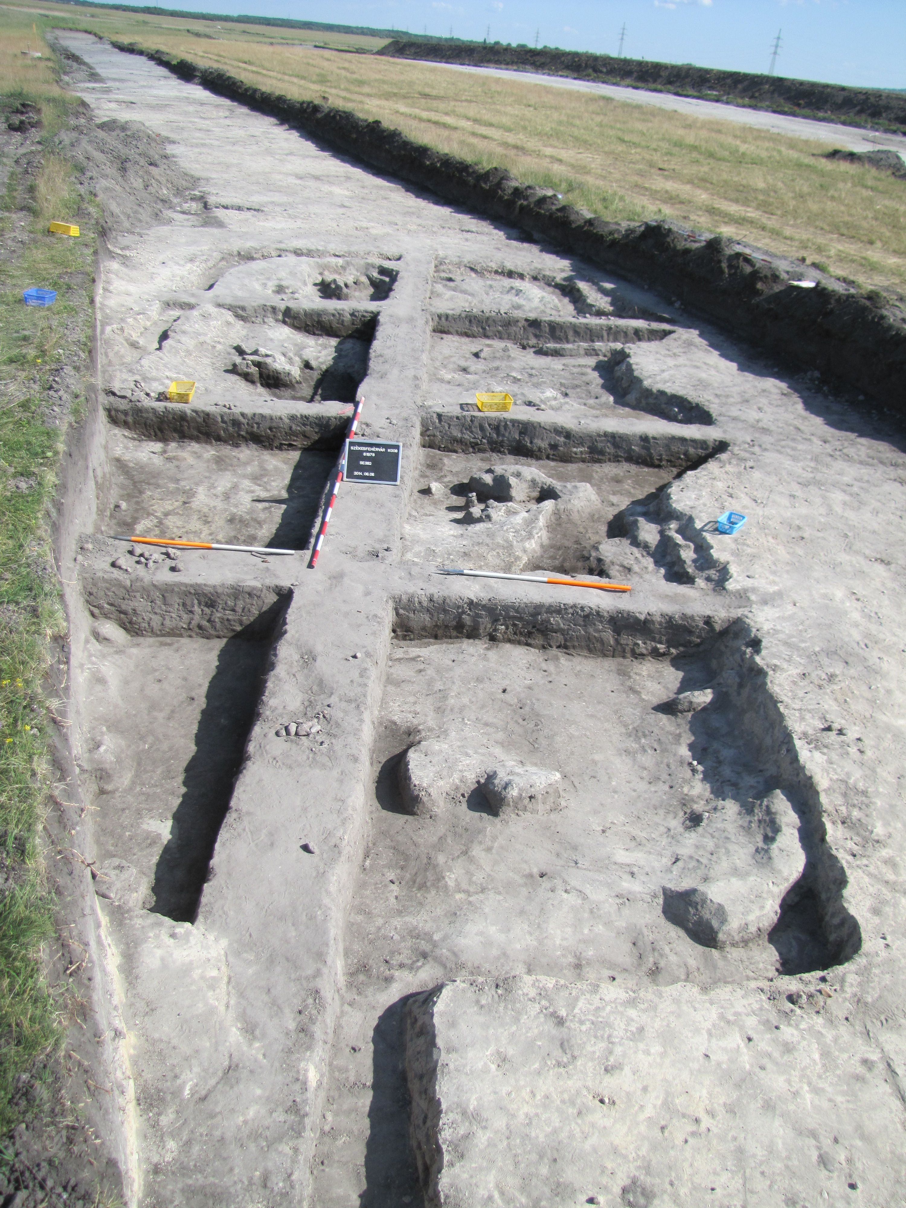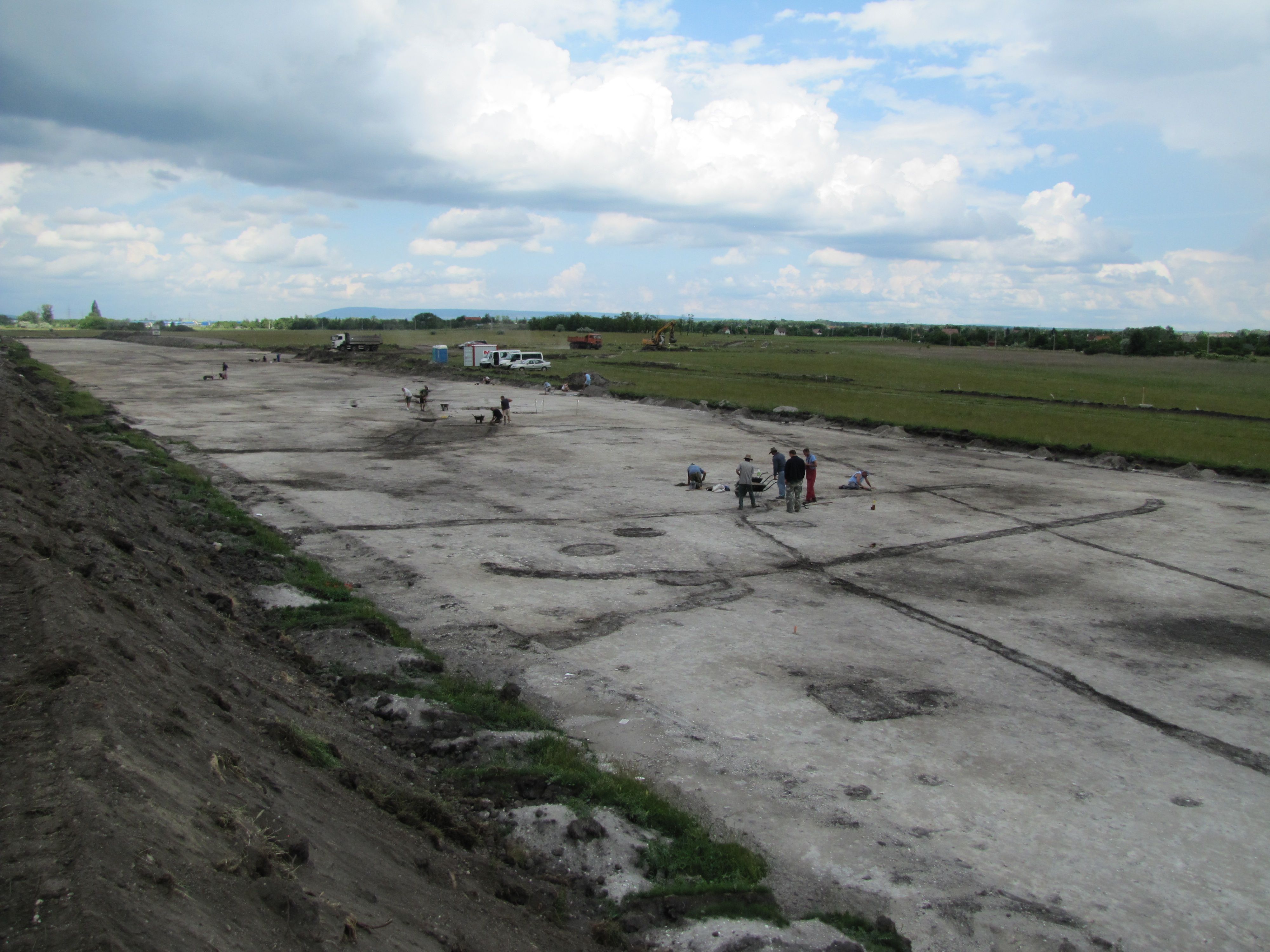 A humusztakaró eltávolítása után a pleisztocén korú, sárga színű altalajban sötétebb színű foltként jelentkeznek a régészeti, történeti korú bolygatások.