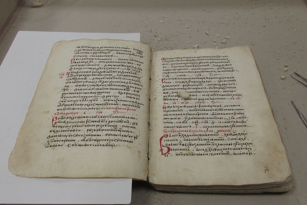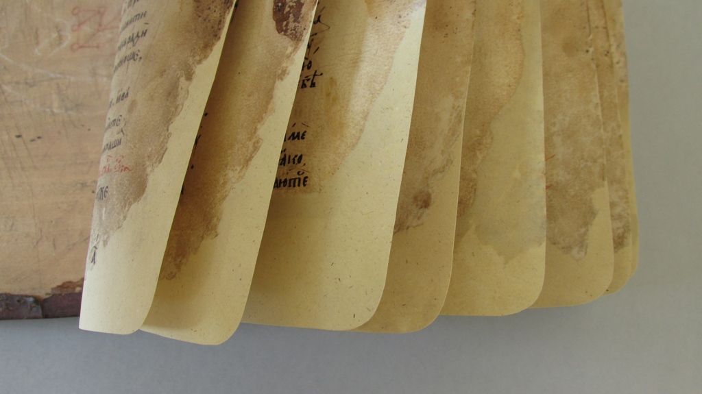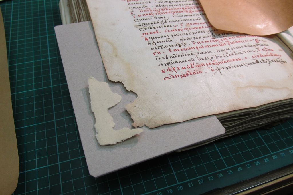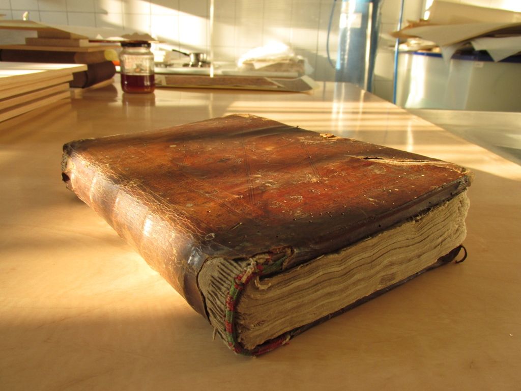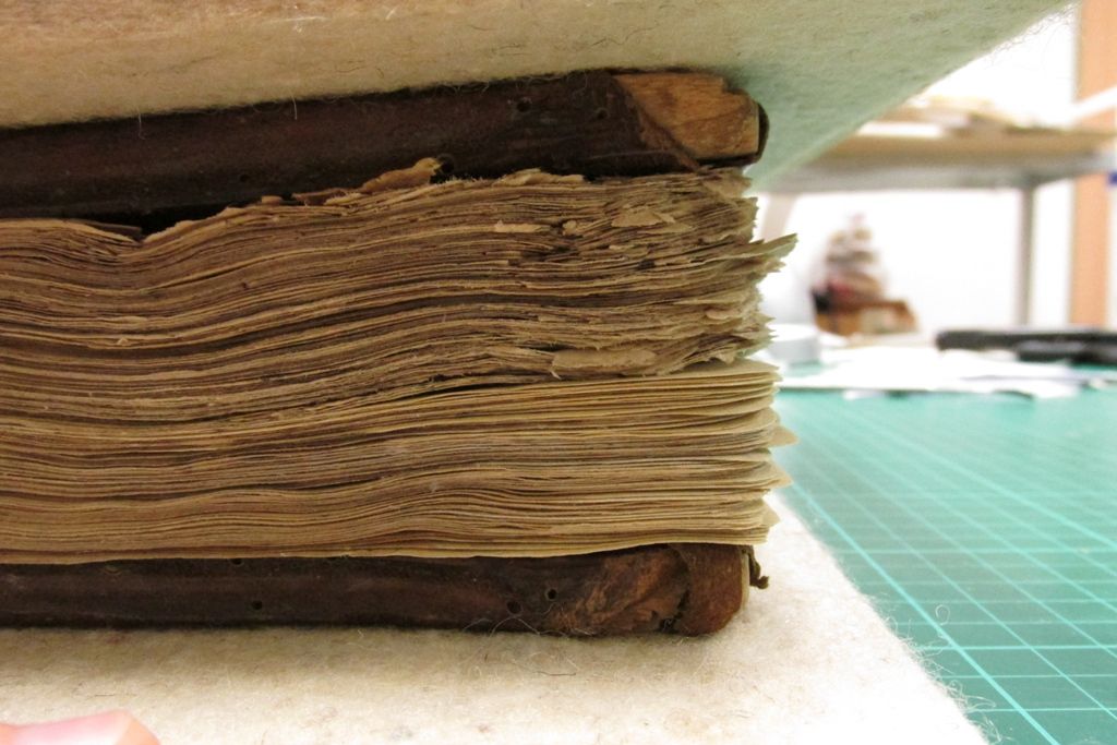 A félbejavított könyvtest. Jól megkülönböztethető a már kijavított alsó rész a javítás előtt álló többi laptól.