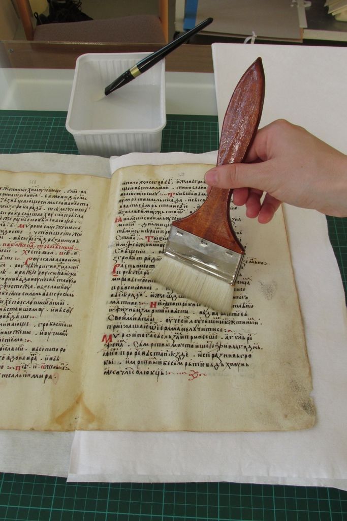 A restaurálás folyamata száraztisztítással kezdődött, mely során a restaurátor puha gumiradírral és latex szivacsradírral egyenként tisztította végig a lapokat.