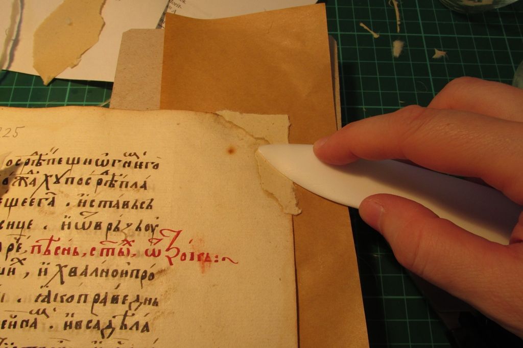 A javításokat a restaurátor cellulózragasztó alkoholos oldatával erősítette fel, és teflon „csonttal” (kisméretű, simító, kézi szerszám) simította le.