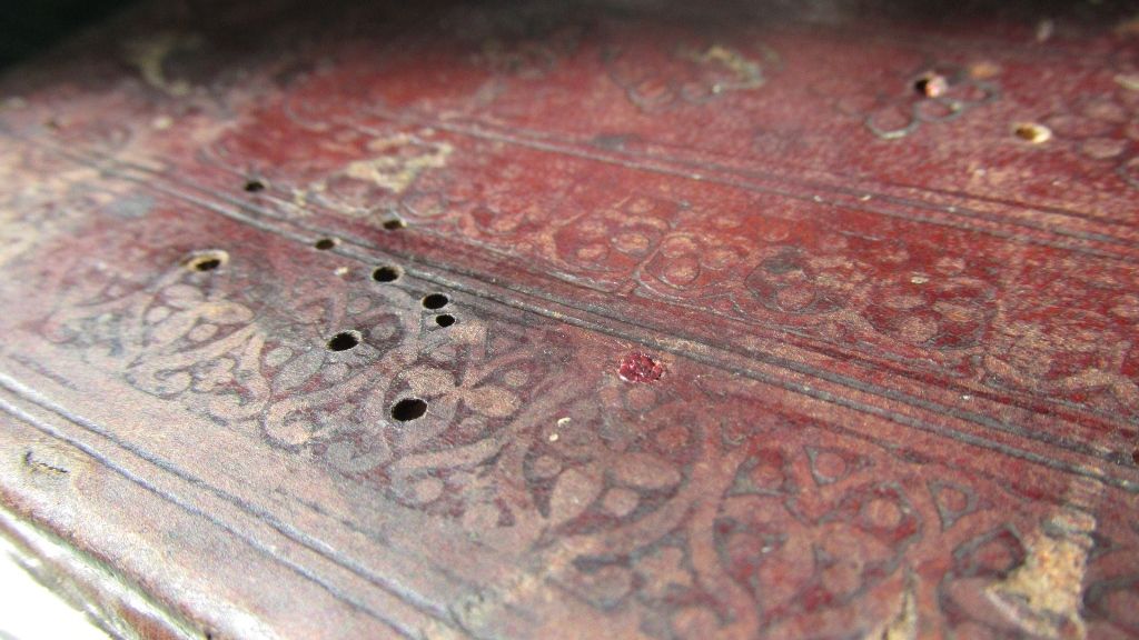 Tisztítás után a kötésbőr színben harmonizáló kecskebőrrel lett kiegészítve. A rovarok kirepülő nyílásait a szakember betömítette, és színben megfelelő árnyalatúra festette. Végül a kötésbőrt bőrápoló pasztával lekente, majd szarvasbőrrel felpolírozta.