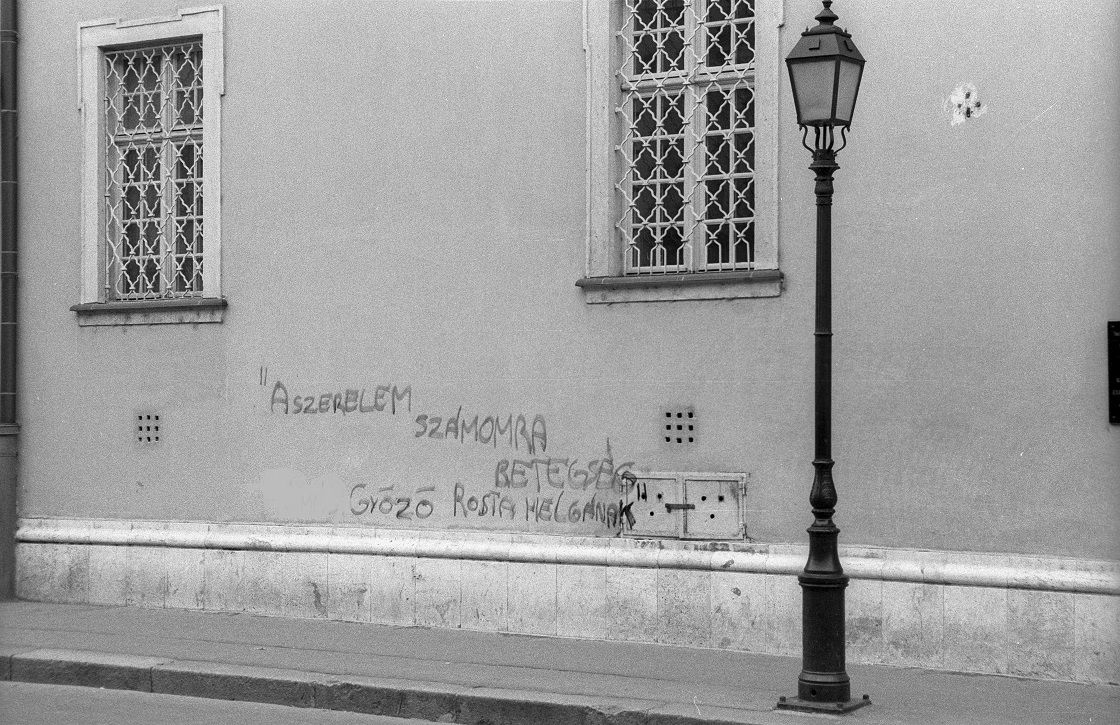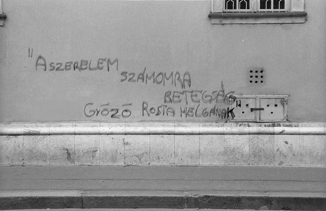 Győző vezetéknevét kitöröltük.) 21 év telt el azóta, a szerelem elmúlt, Győző családos ember, tudtam meg Rosta Helgától, aki kissé zavarba jött a fényképek láttán. "Legelső komoly szerelem volt" - árulta el Helga, aki úgy tudja, hogy a fiatalember barátai fújták a falra a szöveget.