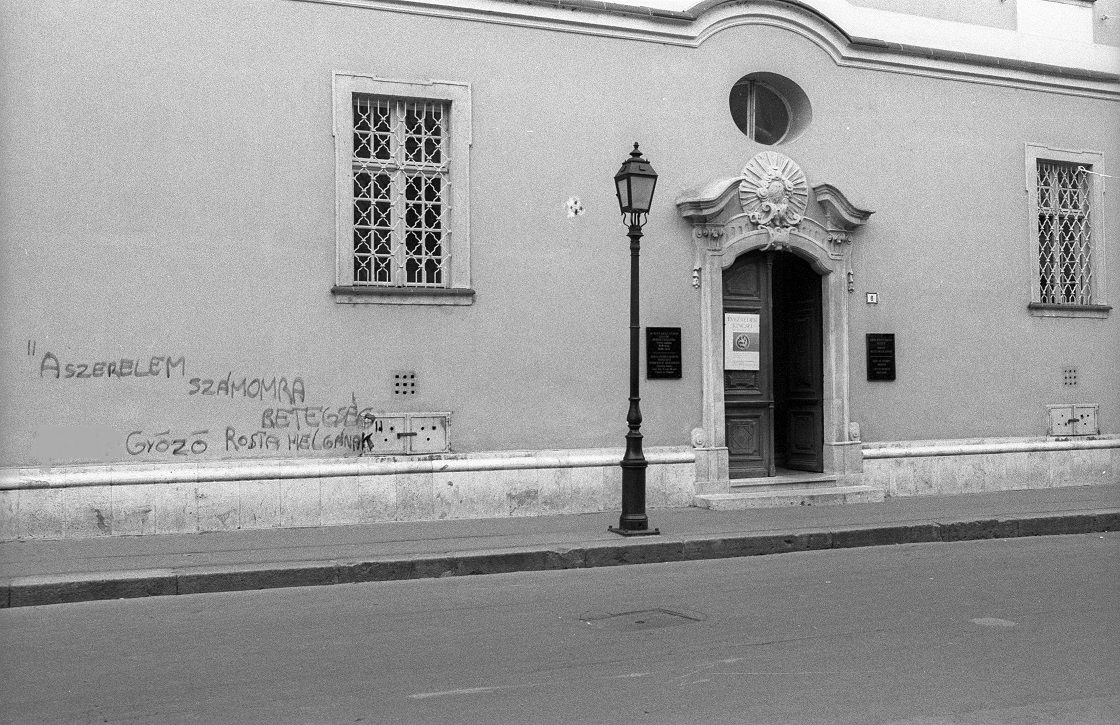 A Szent István Király Múzeum fotóarchívumában egy 1994-es El Kazovszkij kiállítás után kutatva szokatlan graffitiről készült fotókra lettünk figyelmesek. A graffiti a múzeum Fő utcai épületének főbejárata mellett volt látható egy rövid ideig. Gelencsér Ferenc, a múzeum fotósa örökítette meg az utókornak, vagyis nekünk.