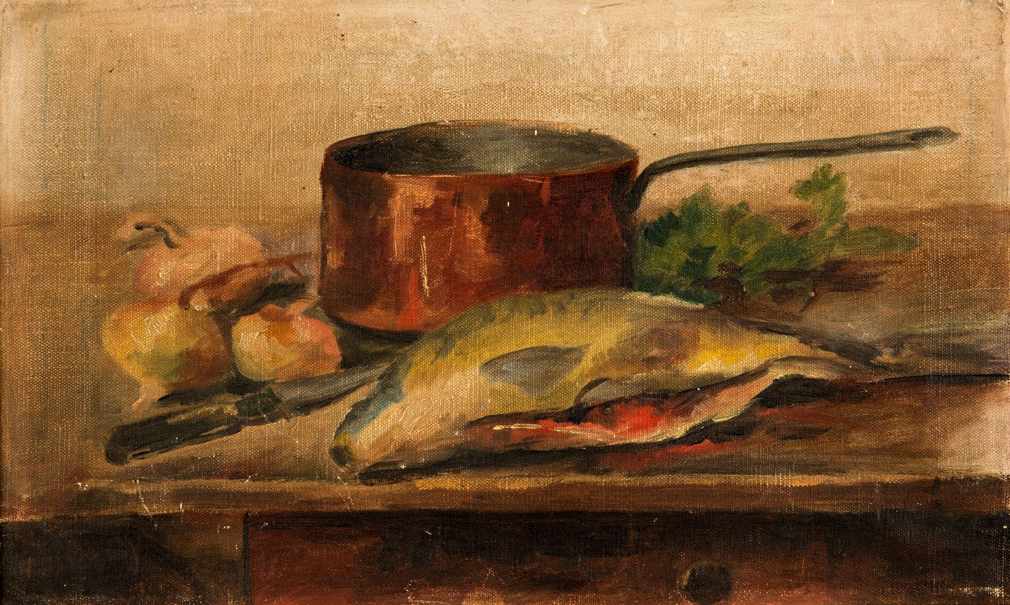 A gyűjteményi katalógusba Lóska Lajos által Hatvanyként felsorolt harmadik mű szerzőségében nem lehetünk teljesen biztosak. Jelzés, aláírás nincs a művön. Lóska attribúcionálását nem indokolja tanulmányban. A kis csendélet fő motívumai egy az asztalon heverő kibelezett hal, hagymák, egy vörösréz-színű nyeles lábas, és a kép szélével teljesen párhuzamosan futó barna asztal lapja. A mű expresszivitását a felénk fordított vörös halbelső adja leginkább, a festői tudást a fényes lábos és a rajta tükröződő fények megfestésének szelíd bravúrjából látjuk igazolva.