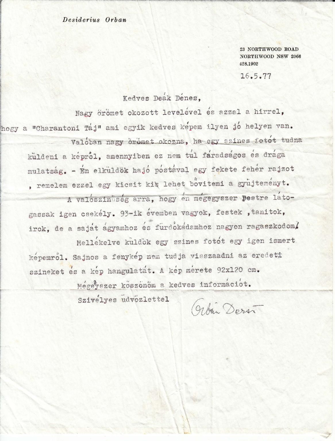 Deák Dénes, miután az alkotást megszerezte (Dévényi Iván gyűjtő és művészeti író révén), levélben kapcsolatot keresett az 55 évesen, 1939-ben Ausztráliába kitelepült művésszel. Így adattárunkban Orbán Dezső négy, Deák Dénesnek írt levelét őrizzük. Az első, 1977. május 16-án írtat, közöljük: