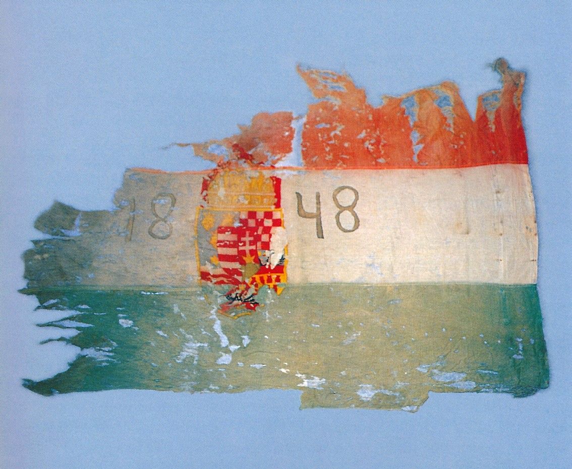 Kor: az alapzászló 1848-ból való, később, a dualizmus korában átalakították, magyar címert varrtak rá