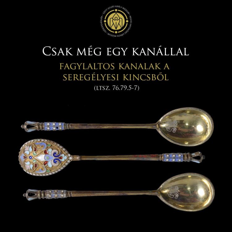 Ebben a rekkenő hőségben különösen jól esik az embernek, ha fagylaltot ehet. Azt nem tudjuk, hogy vajon még élvezetesebb-e, ha ezt a képen látható, zománc díszítéssel is ellátott, aranyozott ezüstkanalakkal teheti meg. Sőt az is lehet, hogy ezek a szemet is gyönyörködtető alkotások nem fagylaltos, hanem mokkáskanalak voltak, így inkább a kávéfogyasztáshoz kapcsolhatók.