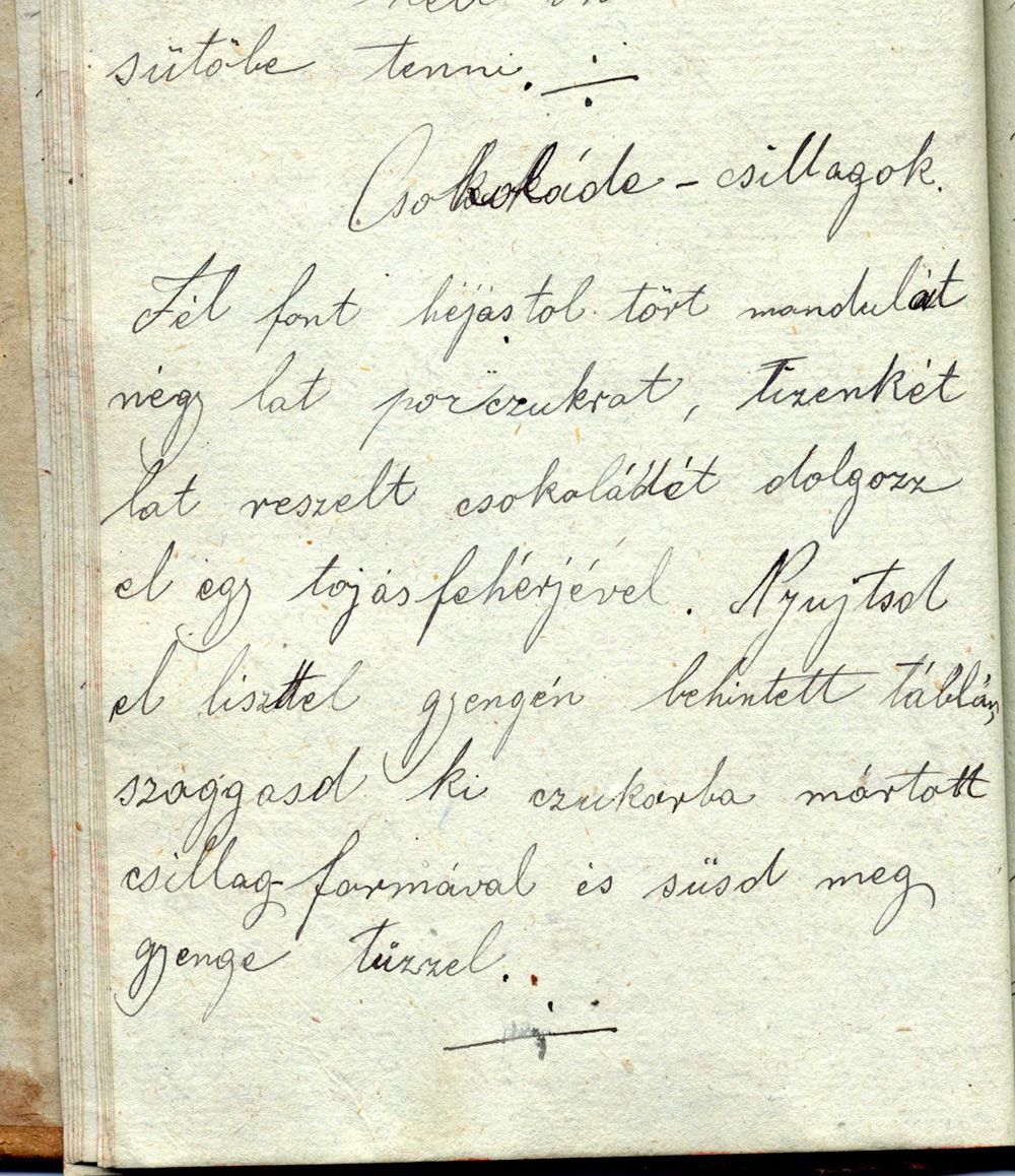 A Szent István Király Múzeum gyűjteményét gyarapítja Müller Janka kéziratos szakácskönyve 1895-ból. A csokoládé csillagok azon kevés receptek egyike, mely csokoládét tartalmaz. Így készül: „Fél font héjastol tört mandulát négy lat porczukrot, tizenkét lat reszelt csokoládét dolgozz el egy tojásfehérjével. Nyujtsd el liszttel gyengén behintett táblán, szaggasd ki czukorba mártott csillag-formával és süsd meg gyenge tűzzel.” A tésztához átszámolva körülbelül 25 dkg darált mandulát 7 dkg (1 lat = 17,5 gramm) porcukorral, 21 dkg reszelt csokoládéval és egy tojásfehérjével kell eldolgozni.