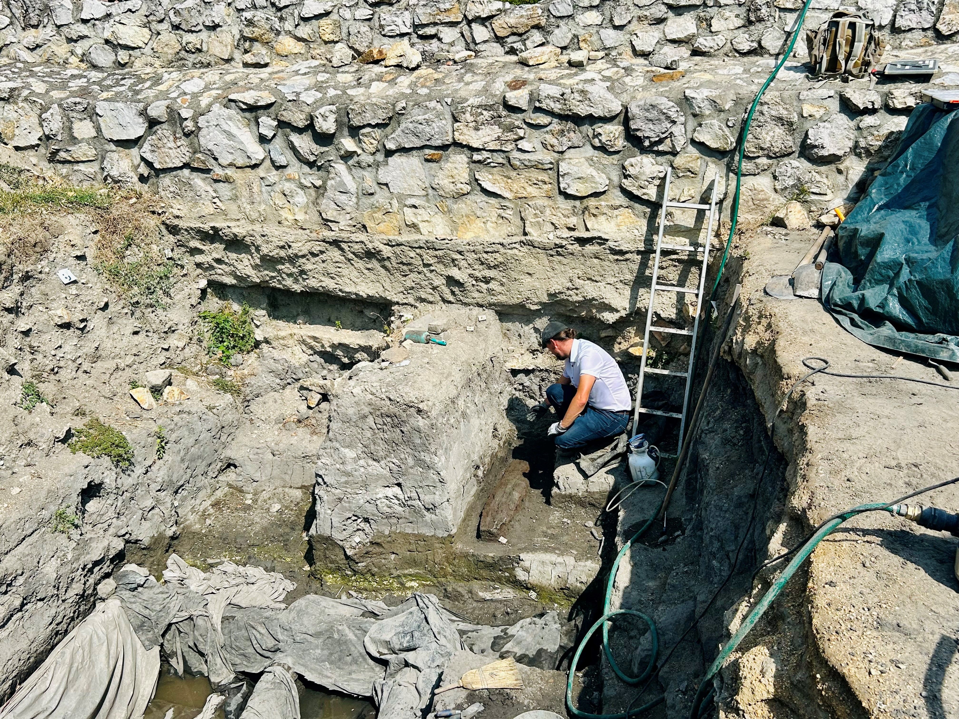 âJelen tudĂĄsunk szerint kĂ©t periĂłdusban törtĂ©n a vĂĄrosfal Ă©pĂtĂ©se. Az elsĆ, amit a Nemzeti EmlĂ©khelyen korĂĄbban megtalĂĄltunk Szent IstvĂĄnhoz köthetĆ, fa-föld szerkezetƱ vĂ©dmƱ. A mĂĄsik a valĂłszĂnƱleg ennek visszabontĂĄsa sorĂĄn kiĂ©pĂtett szintĂ©n fa alapozĂĄsĂș â a mocsaras terĂŒlet miatt â kĆfal kiĂ©pĂtĂ©se a XI. szĂĄzad közepĂ©nâ â mondta el a legĂșjabb lelet kapcsĂĄn Pokrovenszki KrisztiĂĄn, ĂĄsatĂĄsvezetĆ rĂ©gĂ©sz.