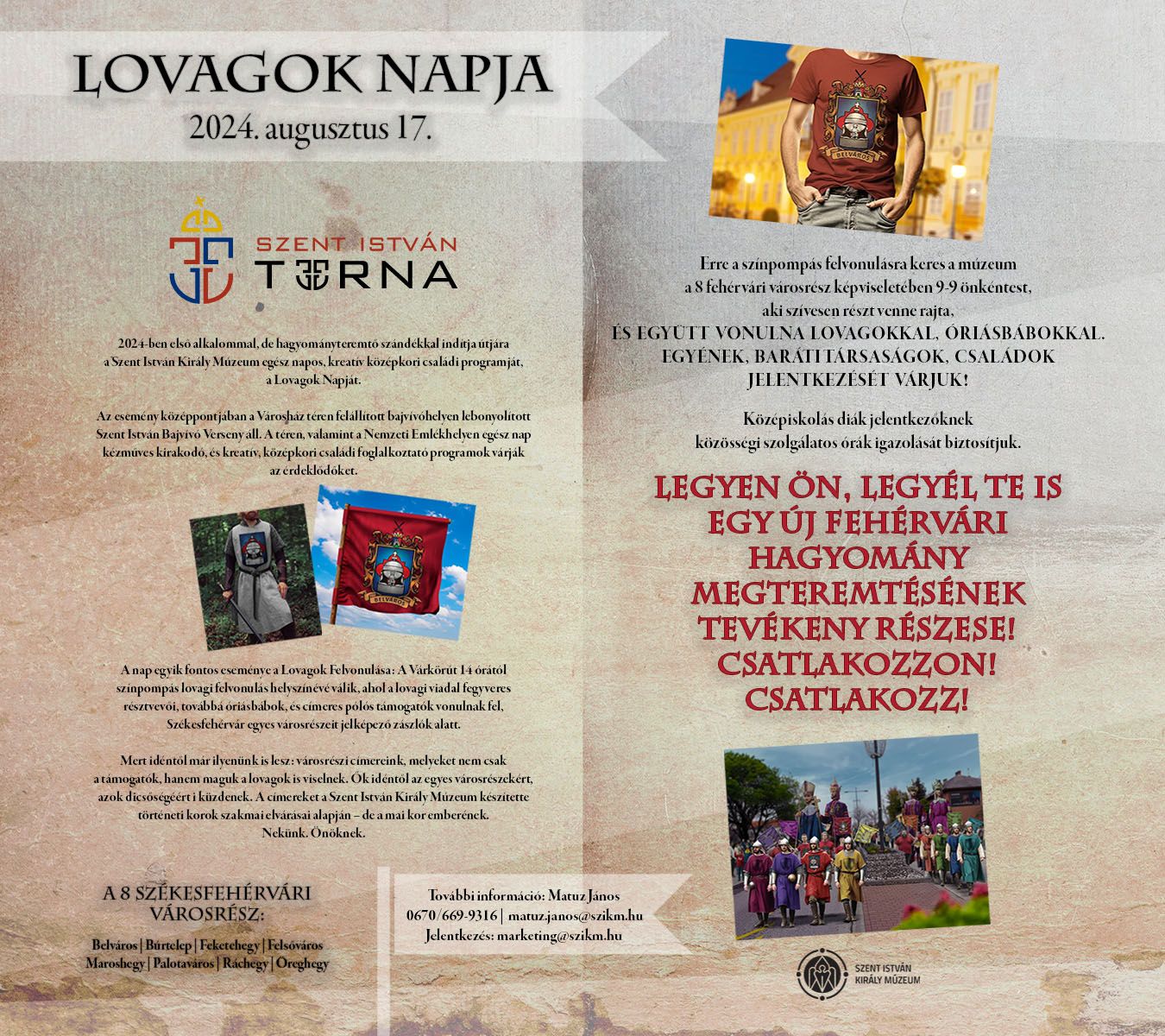 Erre a színpompás felvonulásra keres a múzeum a 8 fehérvári városrész – Belváros, Búrtelep, Feketehegy, Felsőváros, Maroshegy, Palotaváros, Ráchegy, Öreghegy – képviseletében 9-9 önkéntest, akik szívesen részt vennének rajta, és együtt vonulnának lovagokkal, óriásbábokkal.