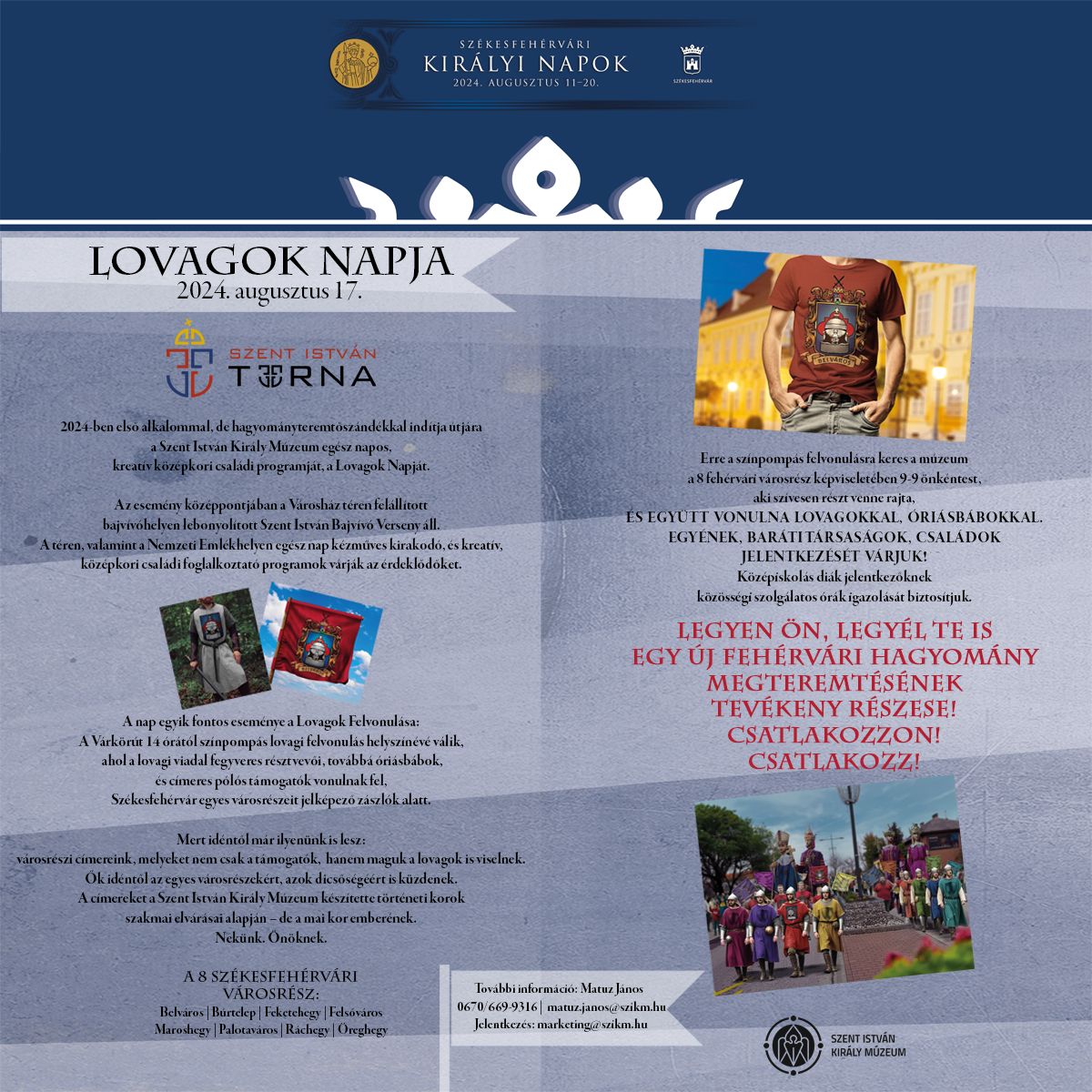 Erre a színpompás felvonulásra keres a múzeum a 8 fehérvári városrész képviseletében 9-9 önkéntest, aki szívesen részt venne rajta, és együtt vonulna lovagokkal, óriásbábokkal. Egyének, baráti társaságok, családok jelentkezését várjuk!